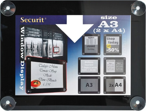 Plastový rámček na sklo slúži k jednoduchému vyveseniu vytlačených informácií na sklo (napríklad informácie o otváracích hodinách…). Rámček má z oboch strán priesvitnú dosku a vytlačené papiere se do nej jednoducho vkládajú nasunutím. Prichytenie na sklo zaisťujú 4 prísavky. Farba: Čierna Rozmery: 39 x 52 cm