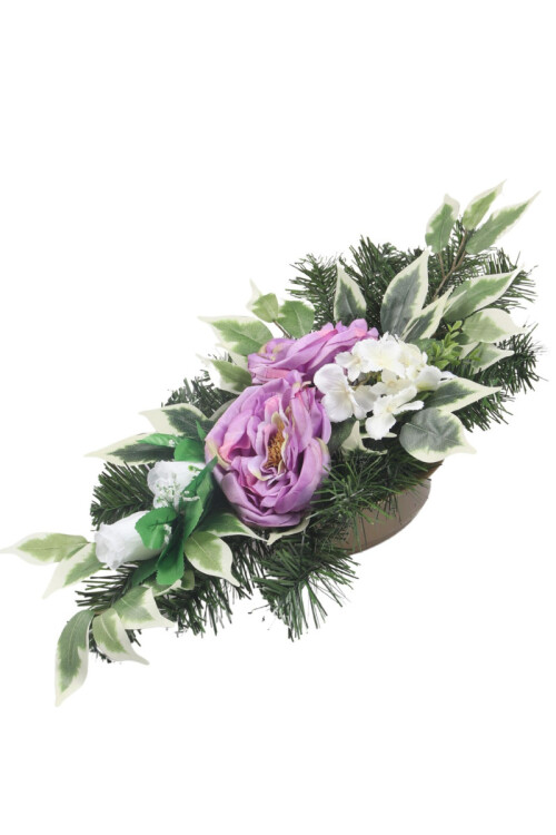 Aranžmán s peóniou, hortenziou, ružami, listami a doplnkami.
