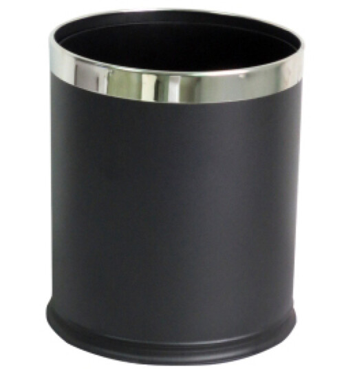Otvorený odpadkový kôš z odolného čierneho plastu s nerezovým okrajom.
