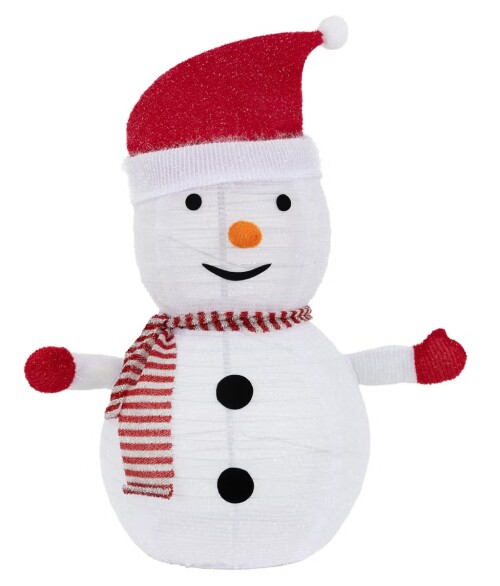 Vianočný snehuliak s 30 LED teplými diódami a časovačom. S jeho výškou 68 cm bude krásne vynikať v interiéri či exteriéri. Snehuliak s čiapkou, šálom a rukavicami obsahuje časovač, a je na batérie, ktoré nie sú súčasťou balenia. Vhodný do interiéru/exteriéru, skladací.