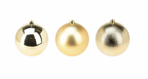 Vianočná guľa s priemerom 18 cm v zlatej farbe je elegantná ozdoba, ktorá rozžiari váš stromček alebo interiér. Dostupná je v 3 rôznych prevedeniach, takže si môžete vybrať alebo kombinovať podľa vlastného vkusu. Skvelá na zavesenie na stromček, okno či do vianočných dekorácií a prináša do priestoru sviatočnú a luxusnú atmosféru.