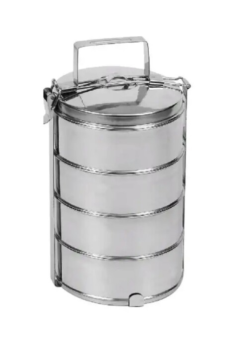 Nerezový pevný obedár na prepravu či uskladnenie jedla, zo 4 dielov, s nerezovým držadlom.