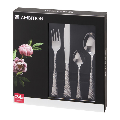 Súprava príborov Bubble pre 6 osôb je perfektnou kombináciou štýlu, odolnosti a funkčnosti. Príbory, vyrobené z vysoko kvalitnej nerezovej ocele, majú elegantný dizajn a ergonomický tvar, ktorý zaisťuje pohodlie pri používaní. Ich nadčasový vzhľad ich predurčuje ako na každodenné stolovanie, tak na elegantné večierky.