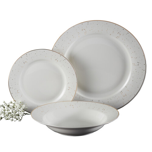 Obedová súprava Aurelia je jedinečnou ponukou, ktorá kombinuje eleganciu porcelánu s moderným dizajnom. Jemný vzor zlatých bodiek a zlatý prúžok na okrajoch tanierov robí túto kolekciou vhodnou ako na každodenné stolovanie, tak na formálne stretnutie s blízkymi. Sada obsahuje plytké, polievkové a dezertné taniere pre 6 osôb, takže je perfektným doplnkom každej domácnosti. Je tiež skvelým darčekom, ktorý zaujme svojou nadčasovou estetikou. Na zachovanie kvality zlatých zdobení sa odporúča ručné umývanie. Súprava nie je vhodná do mikrovlnej rúry.