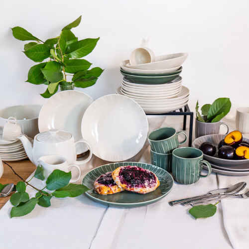 Elegantná súprava tanierov Ligne v zelenej farbe je vyrobená z vysoko kvalitného porcelánu a kombinuje nadčasový štýl a funkčnosť. Jemný tlačený vzor na okrajoch tanierov dodáva kolekcii Ligne moderný charakter a umocňuje estetickú príťažlivosť každého jedla. Vďaka jednoduchému dizajnu sa sada dokonale hodí k rôznym štýlom prestierania – klasickému aj minimalistickému. Porcelán použitý na jej výrobu je vysoko odolný voči každodennému používaniu a jeho hladký povrch uľahčuje čistenie. Je to perfektná voľba ako pre rodinné večere, tak aj pre elegantné stretnutie. Použitie v umývačke riadu av mikrovlnnej rúre navyše zvyšuje pohodlie pri používaní.