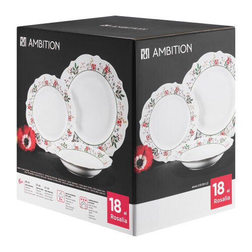 18-dielna jedálenská súprava Rosalia je jedinečnou voľbou pre tých, ktorí oceňujú klasickú eleganciu a prírodné inšpirácie. Je vyrobená z vysoko kvalitného porcelánu a poteší romantickým vzorom s červenými makmi, malými modrými kvetmi a zelenými listami, ktoré vytvárajú harmonickú a jemnú kompozíciu. Každý kus súpravy má ozdobný, vlnitý okraj s jemným zeleným akcentom, ktorý zvýrazňuje kvetinový motív. Súprava je ideálna na každodenné stolovanie, ako aj na špeciálne príležitosti – vhodná na domáce použitie alebo ako darček. Obsahuje taniere na večeru, hlboké taniere a dezertné taniere – všetko, čo potrebujete na elegantné stolovanie pre 6 osôb.