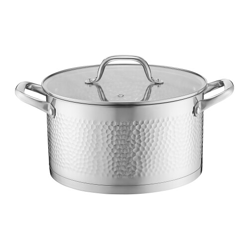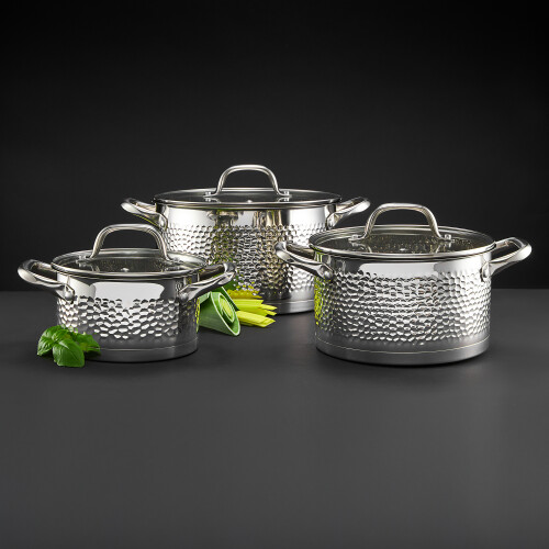 Sada 3 hrncov s pokrievkami Bubble kombinuje moderný dizajn s praktickosťou každodenného varenia. Hrnce sú vyrobené z vysoko kvalitnej nerezovej ocele a ich elegantný tepaný povrch im dodáva jedinečný charakter. Jednoduchý tvar a nadčasový vzhľad z nich robí perfektnú voľbu do každej kuchyne – klasickej aj modernej. Každý hrniec je vybavený sklenenou pokrievkou, ktorá vám umožňuje sledovať proces varenia bez toho, aby ste ju museli dávať dole. Vstavaná stupnica objemu na vnútornej stene uľahčuje odmeranie správneho množstva tekutín. Hrnce sú vhodné pre všetky typy sporákov, vrátane indukcie, a dajú sa umývať v umývačke riadu.