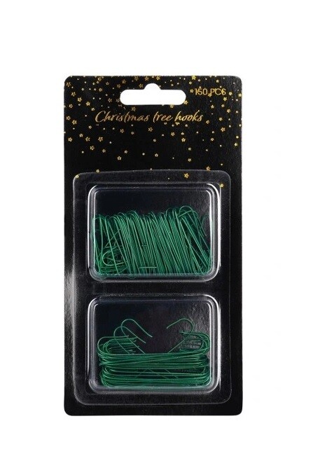Sada 150 zelených háčikov v dvoch veľkostiach, ideálnych na zavesenie vianočných gulí a ozdôb na stromček. Súprava obsahuje väčšie háčiky s dĺžkou 6 cm a menšie s dĺžkou 3,5 cm.