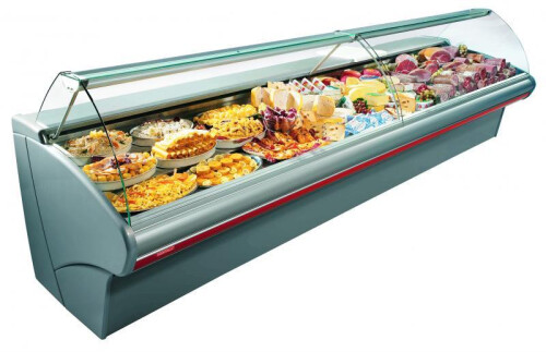 Obslužný pult so vstavaným agregátom, statickým chladením, sivou pracovnou plochou odolnou voči poškriabnutiu - hrúbka 310 mm, oblým predným sklom, ktoré sa otvára nadol, osvetlenou sklenenou obslužnou policou, elektrickým ovládacím panelom, elektrickým termostatom, zadnými dvierkami, nerezovou výstavnou plochou, vypnutým automatickým odmrazovaním, vyberateľnou nádobou na kondenzovanú vodu, 2 sivými bočnicami -hrúbka 40 mm.