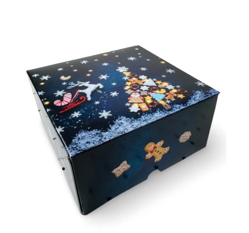 Darčeková krabica je dodávaná plochá a vopred zložená, aby sa minimalizovalo poškodenie počas prepravy a ušetrilo miesto pri skladovaní. Stačí ju rozložiť v jednom jednoduchom kroku a naplniť ju svojimi darčekmi. Vyrobená z vysoko kvalitného potravinárskeho laminovaného kartónu, ktorý zabraňuje presakovaniu mastnoty. Krabička nemá vnútorný rozdeľovač.