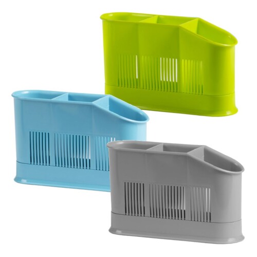 Odkvapkávač na príbory s troma komorama je vyrobený z plastu. Tri komory umožňujú ľahký prístup k príborom rôznych veľkostí a zaisťujú stabilitu dlhých príborov či kuchynských pomôcok pri sušení. Odkapávač má odnímateľnú základňu, ktorá zbiera prebytočnú vodu. Praktický, ľahko sa udržuje v čistote.