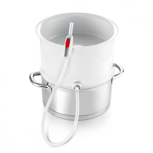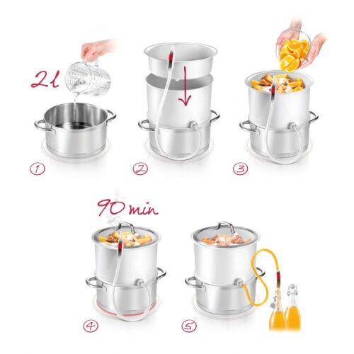 Vynikajúca na prípravu domácich ovocných a zeleninových sirupov, prírodných štiav, želé a džemov. Vhodná pre všetky kastróly a hrnce TESCOMA s pokrievkou ¤ 24 cm a ostatného riadu rovnakej veľkosti. Vyrobená z prvotriedneho odolného plastu, pružná silikónová hadička na stáčanie do fliaš je vybavená uzáverom. Návod na použitie je súčasťou balenia. 3 roky záruka.