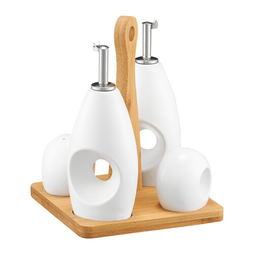 Praktická sada na dochucovadlá Natural je dokonalým riešením do každej jedálne. Súprava obsahuje štyri porcelánové nádobky – dve fľaštičky na olivový olej a ocot a soľničku s koreničkou. Všetky prvky sú umiestnené na štvorcovej základni z odolného bambusového dreva, ktorá je vybavená úchytom. Vďaka kombinácii matne bieleho porcelánu a prírodného dreva sa set skvele hodí do moderných a škandinávskych interiérov. Súprava Natural je praktickým doplnkom do každej kuchyne a jedálne, ktorý na stole vyzerá krásne a dodáva jej prirodzené kúzlo.