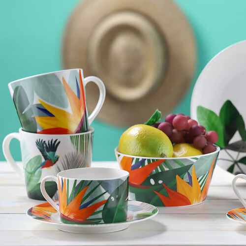 Porcelánová miska, ktorá je súčasťou kolekcie Paradise, je nádhernou ukážkou exotiky prenesenej do domáceho riadu. Povrch vyžaruje energiu, ktorej zdrojom je veľkolepé znázornenie kvetu Strelitzia, dominujúceho tejto jedinečnej sérii. Na pozadí misky je zelená krajina exotických listov, ktorá vytvára úžasnú kompozíciu, pripomínajúcu letné dni a vzdialené cesty. Táto nevšedná, šalátová miska sa skvele hodí k zvyšku sady zo série Paradise. Je ideálnou voľbou pre tých, ktorí oceňujú originálne spojenie porcelánovej tradície s moderným, odvážnym designom.