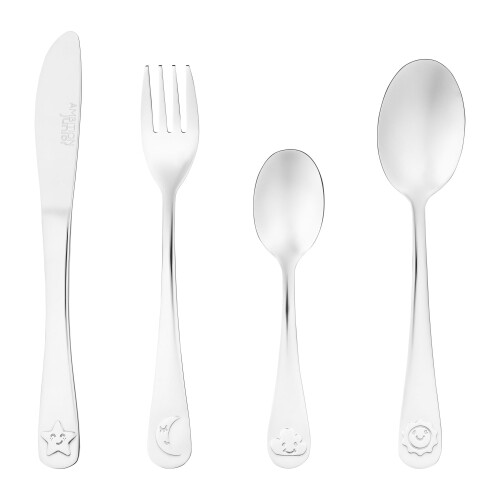 Sada príborov Junior Sky je praktická a očarujúca sada určená špeciálne pre najmenšie deti. Sada je vyrobená z vysoko kvalitnej nerezovej ocele a obsahuje: 1 x príborový nôž, 1 x vidličku, 1 x polievkovú lyžicu a 1 x čajovú lyžičku, vo veľkostiach pre detské ručičky. Zaoblené hrany zaisťujú bezpečnosť pri jedle, zatiaľ čo decentné gravírované motívy – hviezda, mesiac, mrak a slnko – spríjemňujú deťom jedlo. Vďaka odolnému materiálu a prevedeniu vhodnému do umývačky riadu sa príbory ľahko udržujú a vydržia dlho, čím podporujú samostatné stravovanie.
