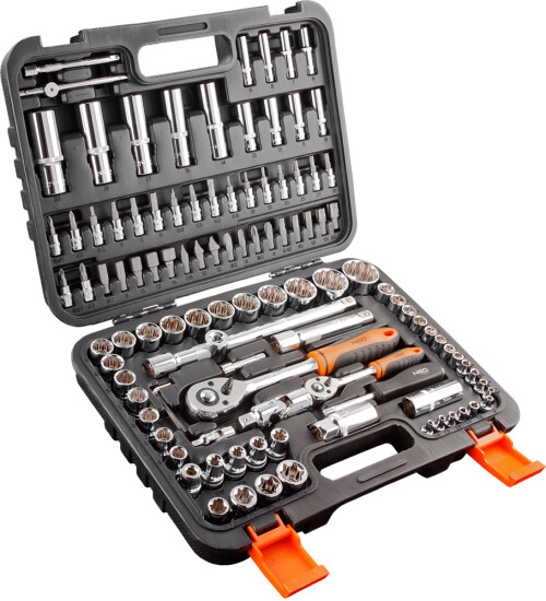 Sada nástrčkových kľúčov 1/2“ a 1/4" NEO TOOLS (ref. č. 08-666), ktorá sa skladá zo 110-tich prvkov, vyrobených z vysoko kvalitnej chróm-vanádiovej ocele. Sada obsahuje ohnuté račne 1/2" a 1/4" (trvalý západkový mechanizmus - 72 zubov ), s ohnutými ergonomickými rukoväťami. Sada obsahuje bohatý balík šesťuholníkových nástrčiek s dvoma dĺžkami, s tlačenými nápismi (vo veľkostiach od 4 do 32 mm), nástrčiek Torx (E4 - E24) a skrutkovacích koncoviek (ploché, krížové, šesťuholníkové, Torx). Doplnkom sady je široký balík príslušenstva. Vertikálne umiestnenie súčastí v kufri pre rýchlejšie skompletizovanie potrebnej sady. Sada je dodávaná v praktickom a pevnom plastovom puzdre s kovovými sponami a praktickým držiakom. Spoľahlivosť výrobku potvrdzuje 25-ročnú záruka a certifikát TÜV Rheinland M + T. Značka NEO TOOLS spĺňa očakávania odborníkov.