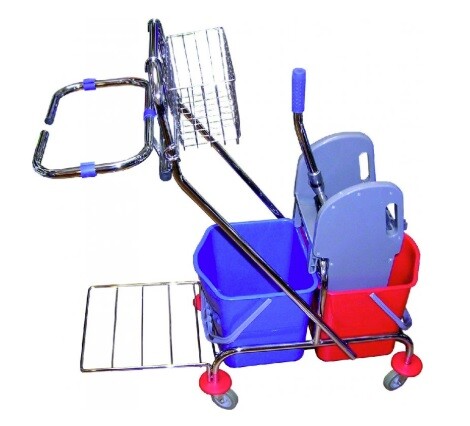 Vozík ekonomickej rady profesionálnej upratovacej techniky. Súčasťou je kovová konštrukcia s kolieskami, kvalitné vedrá 2ks 17L, vertikálny lis, preklápacia rukoväť, držiak a podpera vreca, košík na rukoväť.