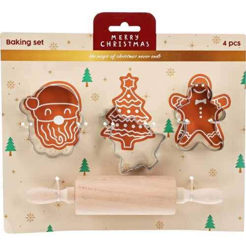 Táto 4-dielna sada na pečenie , ideálna na sviatky, obsahuje drevený valček na cesto a tri kovové vykrajovačky na sušienky : Santa Clausa, vianočný stromček a perníkového mužíka. Ideálna na výrobu rôznych sviatočných koláčikov.