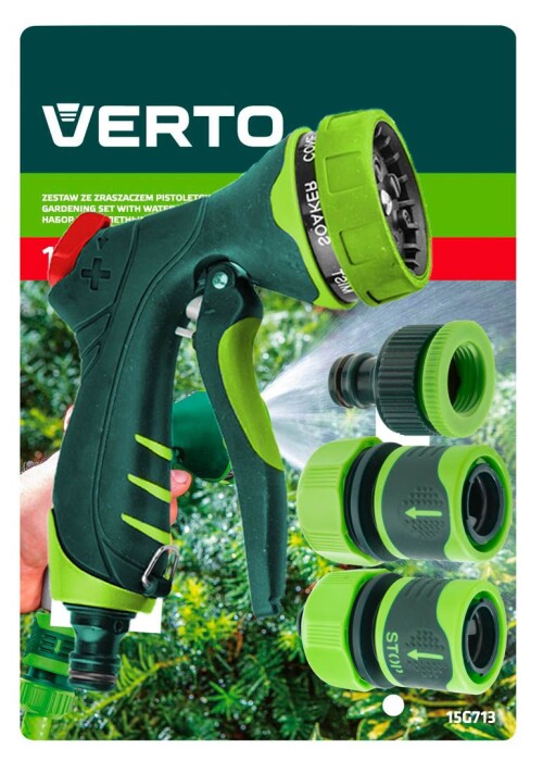 Sada so striekacou pištoľou, armatúrami z dvoch materiálov, pripojením kohútika VERTO (ref. 15G713). Sada sa skladá zo 4 prvkov: 7-funkčný postrekovač pištole, 1/2 "priamy konektor, 1/2" stop konektor, 1/2 "kohútikové pripojenie.