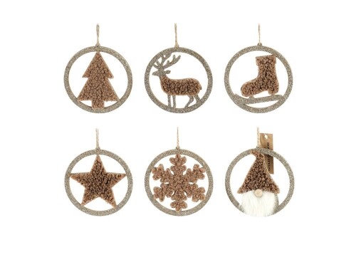 Závesná dekorácia z dreva s vianočným motívom z hnedej látky.